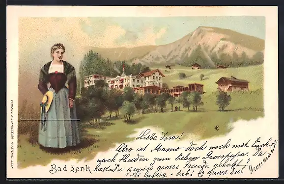 Lithographie Bad Lenk, Panorama mit Gebirge