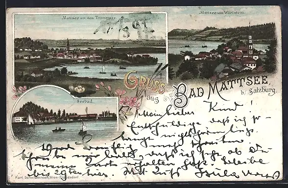 Lithographie Bad Mattsee, Blick zum Seebad, Ortsansicht mit Trumersee
