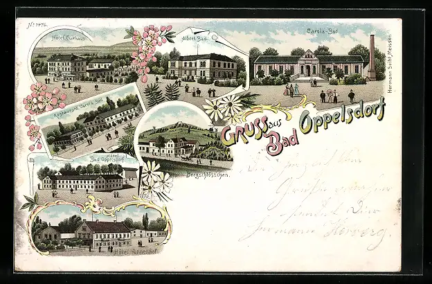 Lithographie Bad Oppelsdorf, Hotel Curhaus, Albert-Bad, Bergschlösschen