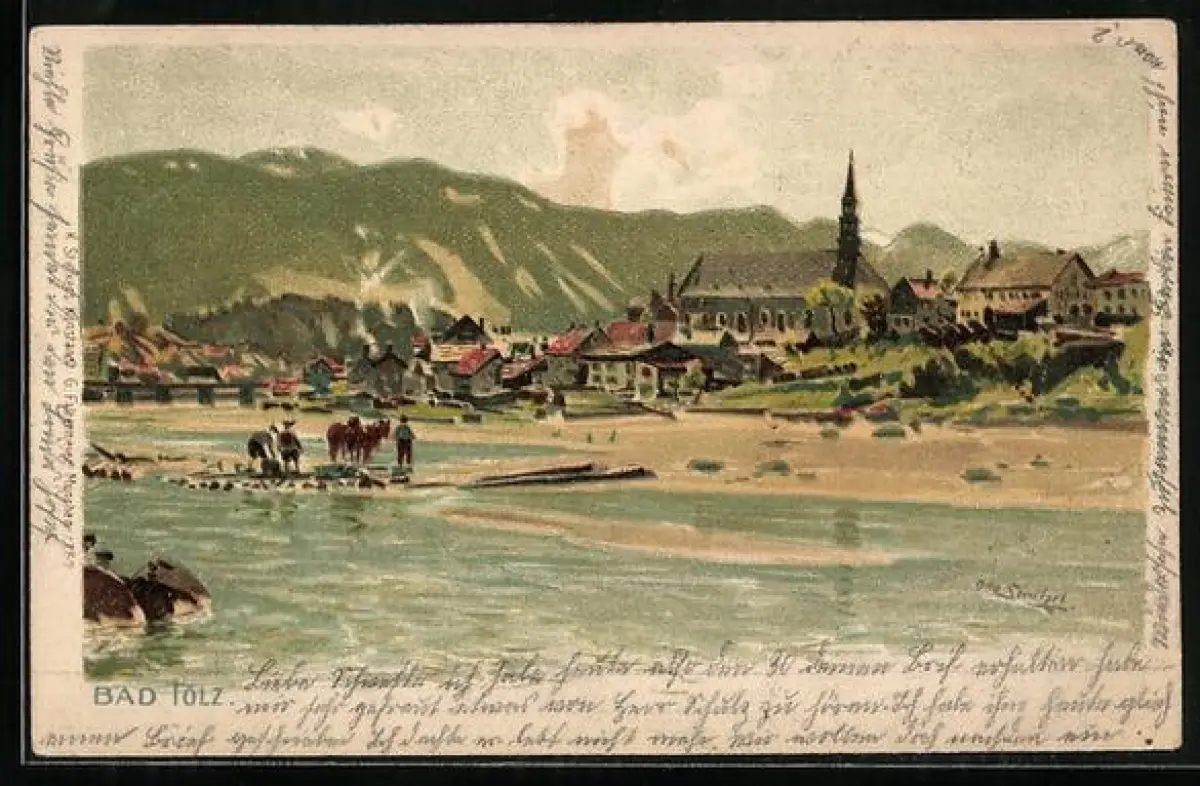 Lithographie Bad Tölz, Ortsansicht vom Wasser aus