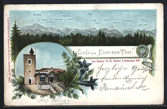 Lithographie Baden, Eisernes Thor und Gebirgspanorama
