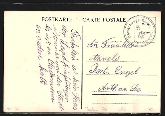 Personenbezogene Daten auf der Rückseite der Karte wurden durch blauen Textmarker unkenntlich gemacht. Die blauen Stellen sind auf die Vorderseite durchgeweicht und wirken sich negativ auf das Postkartenfoto aus