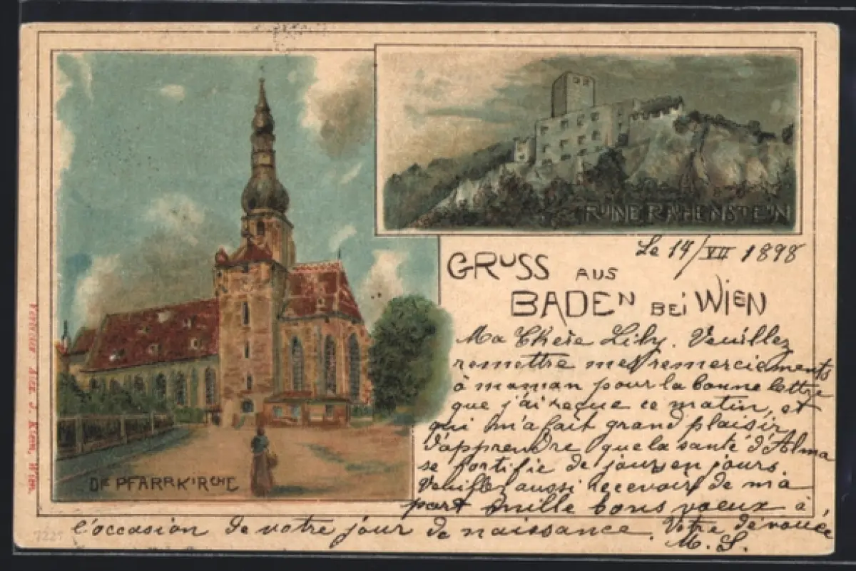 Lithographie Baden, Pfarrkirche und Ruine Rauenstein