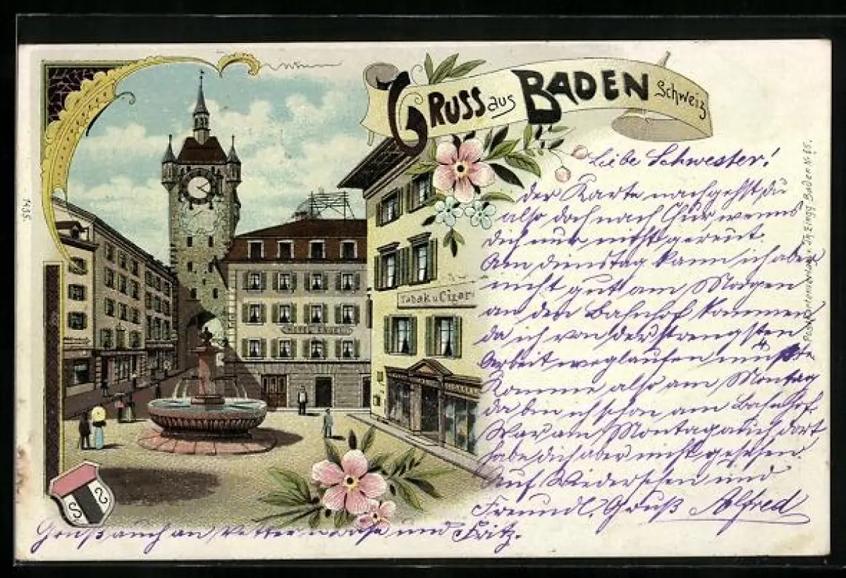 Lithographie Baden /Schweiz, Ortspartie am Hotel Engel