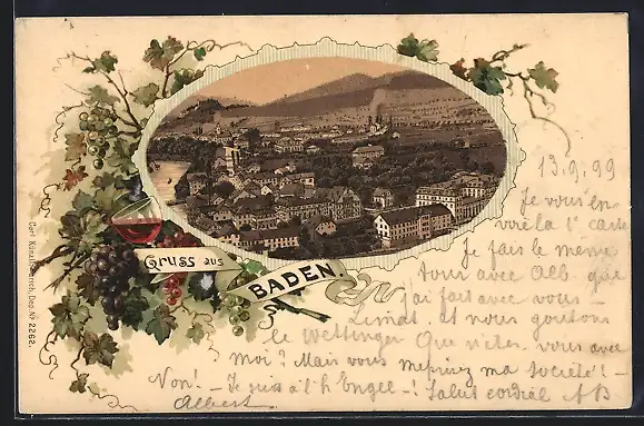 Lithographie Baden, Stadtpanorama im Wein-Passepartout