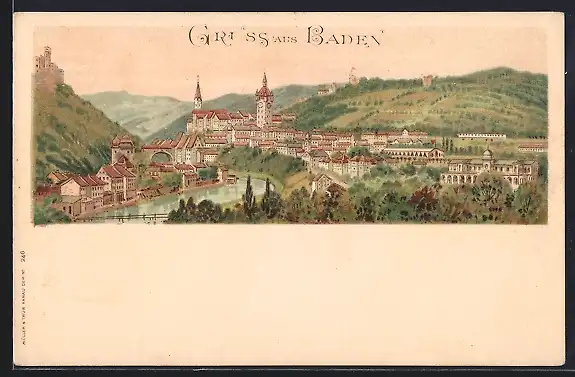 Lithographie Baden, Teilansicht mit Kirche