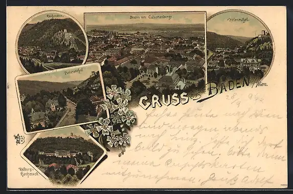 Lithographie Baden, Weilburg und Rauheneck, Helenenthal, Rauhenstein
