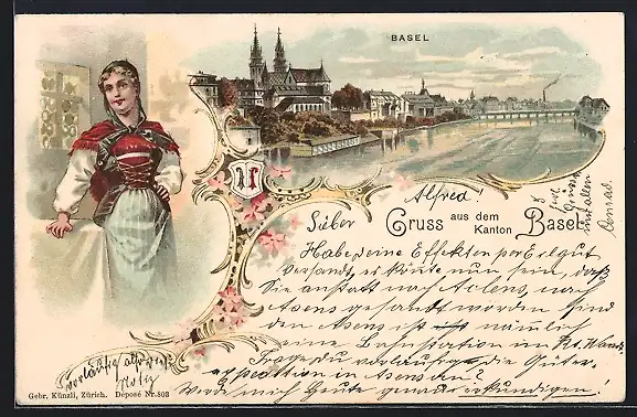Lithographie Basel, Blick auf Fluss mit Brücke und Kirche, Frau in Tracht