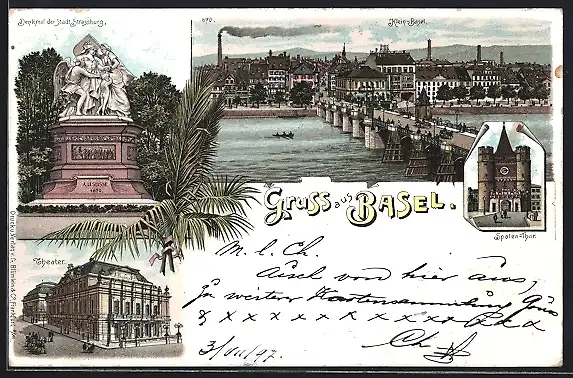 Lithographie Basel, Blick auf Klein-Basel, Spalen-Thor und Theater
