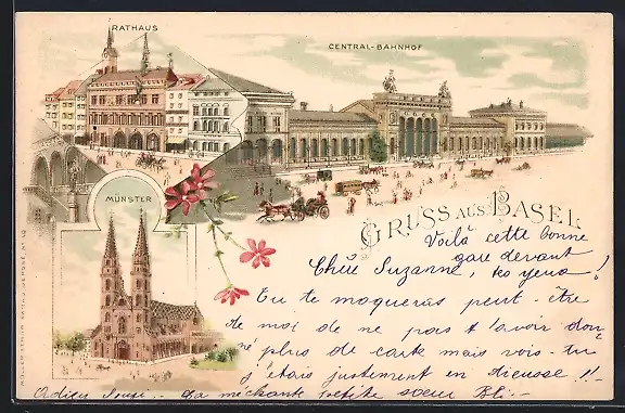 Lithographie Basel, Central-Bahnhof, Münster und Rathaus