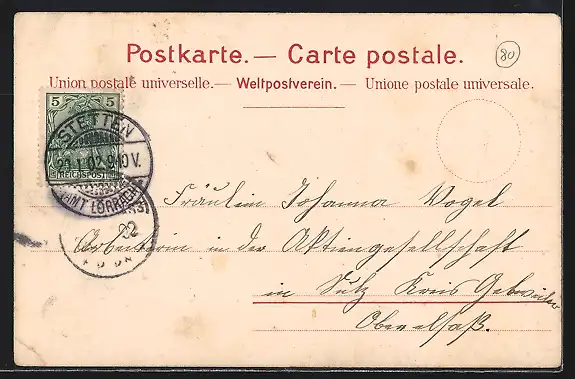 Personenbezogene Daten auf der Rückseite der Karte wurden durch blauen Textmarker unkenntlich gemacht. Die blauen Stellen sind auf die Vorderseite durchgeweicht und wirken sich negativ auf das Postkartenfoto aus