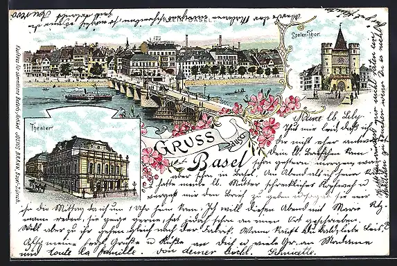 Lithographie Basel, Gesamtansicht Klein-Basel, Theater, Spalenthor