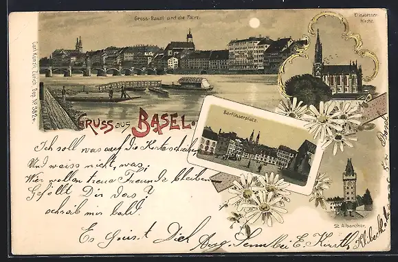 Lithographie Basel, Gross-Basel und die Fähre, Elisabethen-Kirche, Barfüsserplatz