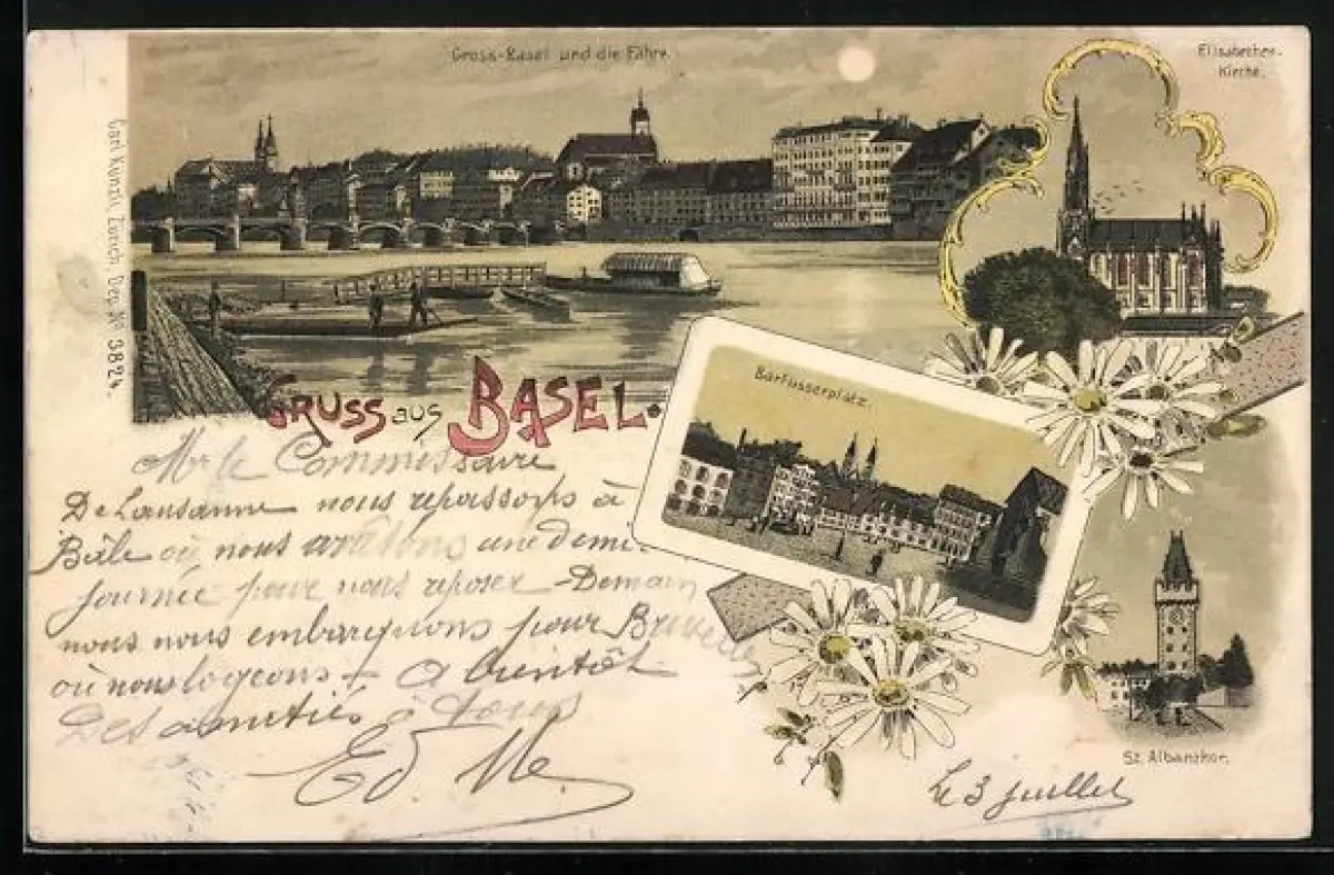 Lithographie Basel, Gross-Basel und die Fähre, Elisabethen-Kirche, Barfüsserplatz