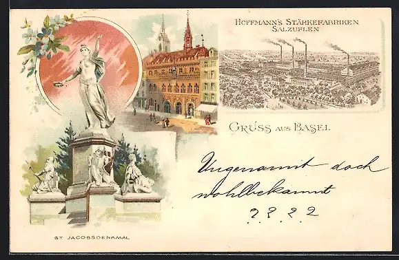 Lithographie Basel, Hoffmanns Stärkefabriken Salzuflen, St. Jakobsdenkmal, Gebäudeansicht