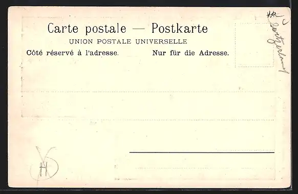 Personenbezogene Daten auf der Rückseite der Karte wurden durch blauen Textmarker unkenntlich gemacht. Die blauen Stellen sind auf die Vorderseite durchgeweicht und wirken sich negativ auf das Postkartenfoto aus