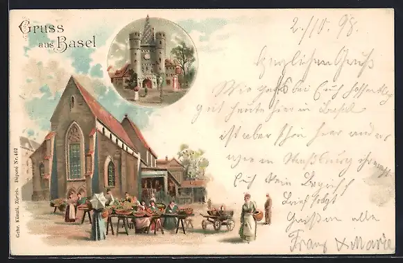 Lithographie Basel, Kirche mit Markt, Tor