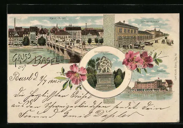 Lithographie Basel, Klein-Basel, Strassburger Denkmal, Central-Bahnhof