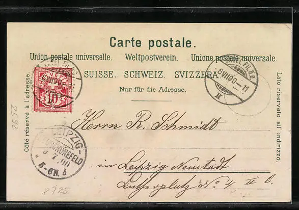 Personenbezogene Daten auf der Rückseite der Karte wurden durch blauen Textmarker unkenntlich gemacht. Die blauen Stellen sind auf die Vorderseite durchgeweicht und wirken sich negativ auf das Postkartenfoto aus