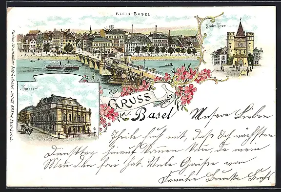 Lithographie Basel, Kleinbasel mit Theater und Spalentor