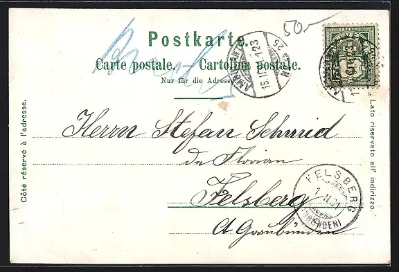 Personenbezogene Daten auf der Rückseite der Karte wurden durch blauen Textmarker unkenntlich gemacht. Die blauen Stellen sind auf die Vorderseite durchgeweicht und wirken sich negativ auf das Postkartenfoto aus