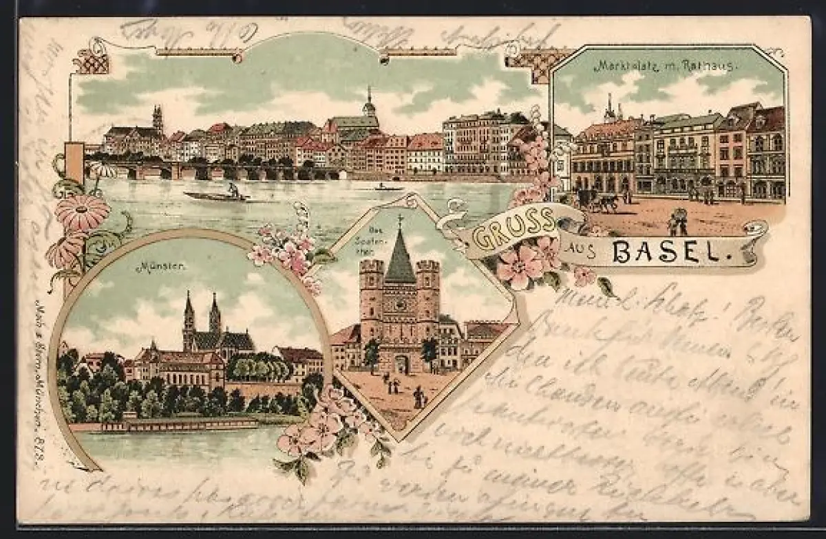 Lithographie Basel, Marktplatz mit Rathaus, Münster, Das Spatentor