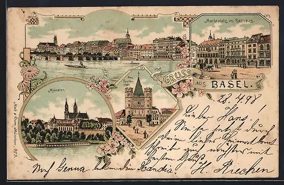 Lithographie Basel, Münster, Das Spatenthor, Marktplatz mit Rathaus