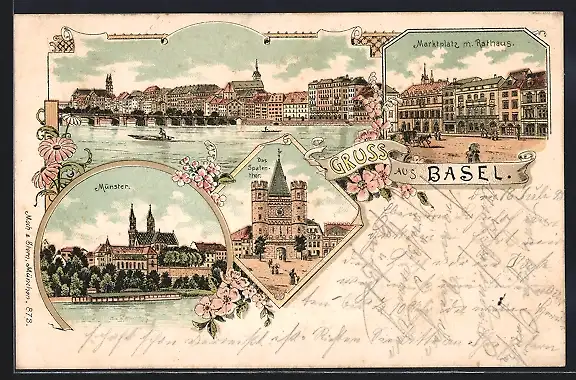 Lithographie Basel, Münster, Das Spatenthor, Marktplatz mit Rathaus