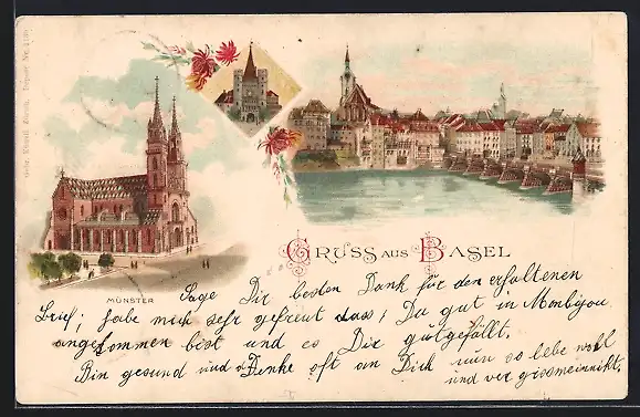 Lithographie Basel, Münster, Rheinbrücke, Blumen