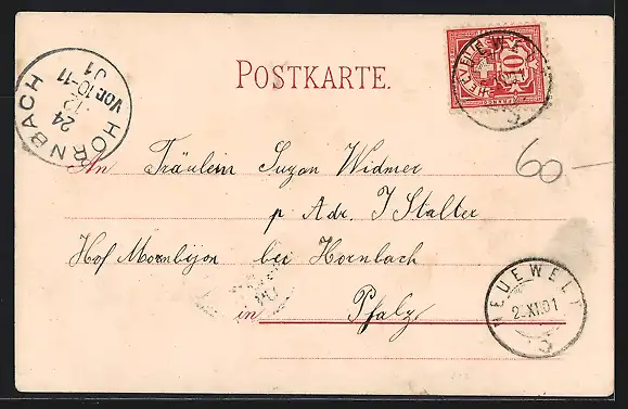 Personenbezogene Daten auf der Rückseite der Karte wurden durch blauen Textmarker unkenntlich gemacht. Die blauen Stellen sind auf die Vorderseite durchgeweicht und wirken sich negativ auf das Postkartenfoto aus