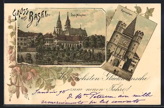 Lithographie Basel, Münster, Spalentor, Neujahrsgruss