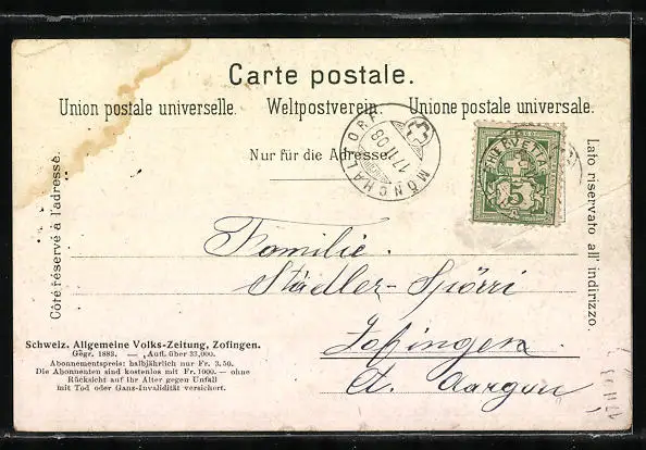 Personenbezogene Daten auf der Rückseite der Karte wurden durch blauen Textmarker unkenntlich gemacht. Die blauen Stellen sind auf die Vorderseite durchgeweicht und wirken sich negativ auf das Postkartenfoto aus