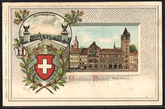 Lithographie Basel, Neues Rathaus und Wetzsteinbrücke, Passepartout mit Wappen