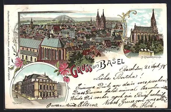 Lithographie Basel, Ortsansicht aus der Vogelschau, St. Elisabethenkirche und Theater