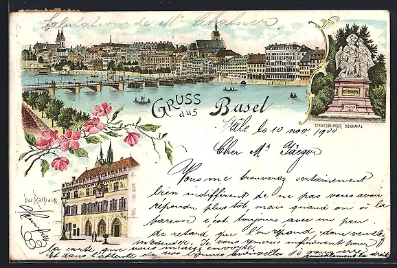 Lithographie Basel, Ortsansicht mit Rheinbrücke, Strassburger Denkmal und Rathaus