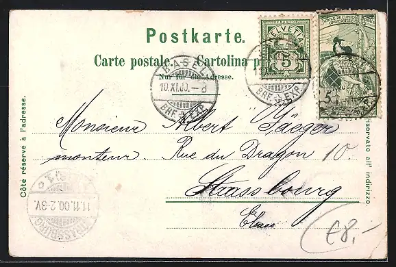 gelaufen 1900, Eckknick links unten, Stempel-Bugspur rechte Kante, guter Zustand