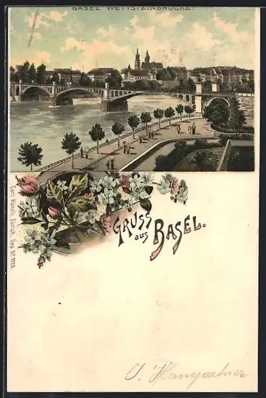 Lithographie Basel, Partie an der Wettsteinbrücke