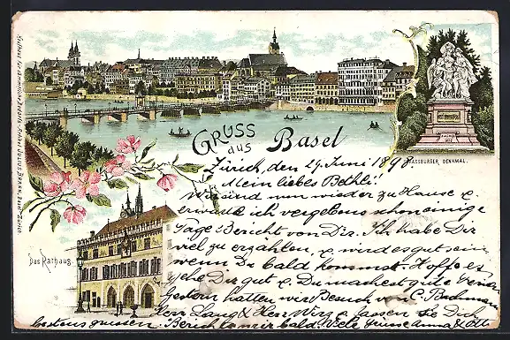 Lithographie Basel, Rathaus, Strassburger Denkmal, Ortspanorama mit Brücke