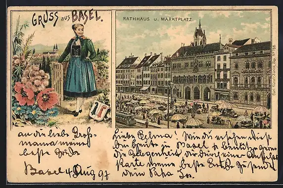 Lithographie Basel, Rathaus und Marktplatz, Baslerin in Tracht