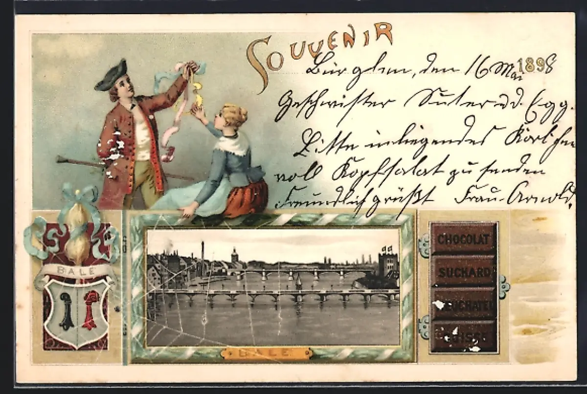 Lithographie Basel, Rheinbrücken, Werbung Chocolat Suchard