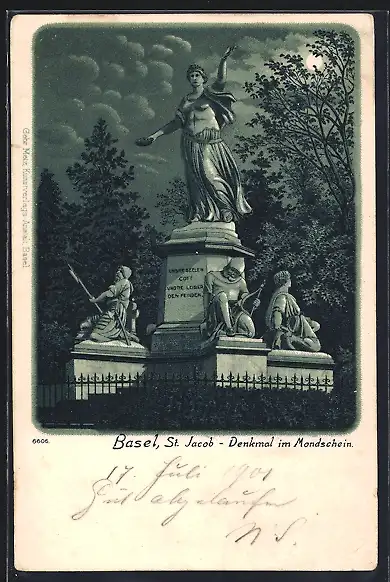 Lithographie Basel, St. Jacob-Denkmal im Mondschein