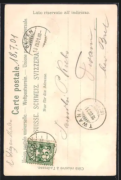 Personenbezogene Daten auf der Rückseite der Karte wurden durch blauen Textmarker unkenntlich gemacht. Die blauen Stellen sind auf die Vorderseite durchgeweicht und wirken sich negativ auf das Postkartenfoto aus