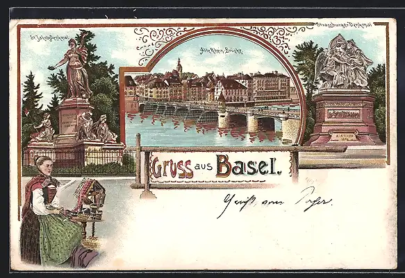 Lithographie Basel, St. Jacobs Denkmal, alte Rheinbrücke, Strassburger Denkmal