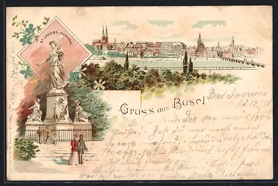 Lithographie Basel, St. Jacobs-Denkmal und Stadtpanorama