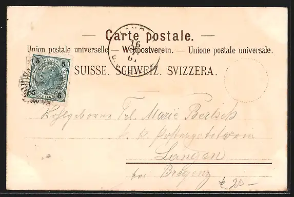 Personenbezogene Daten auf der Rückseite der Karte wurden durch blauen Textmarker unkenntlich gemacht. Die blauen Stellen sind auf die Vorderseite durchgeweicht und wirken sich negativ auf das Postkartenfoto aus