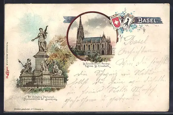 Lithographie Basel, St. Jacobsdenkmal & St. Elisabeth-Kirche