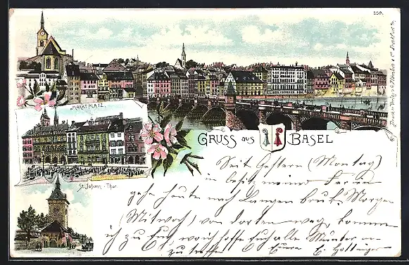 Lithographie Basel, St. Johann-Tor, Marktplatz, Stadtpanorama, Wappen