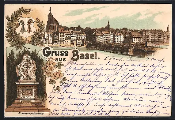 Lithographie Basel, Strassburg-Denkmal, Teilansicht mit Brücke und Kirche