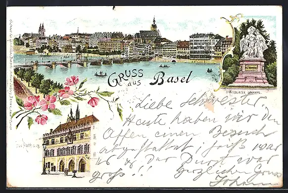 Lithographie Basel, Strassburger-Denkmal, Rathaus, Ortsansicht