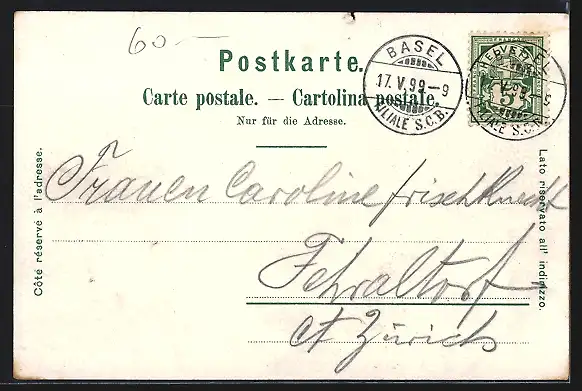 gelaufen 1899, kleiner Einriss oben mittig, guter Zustand
